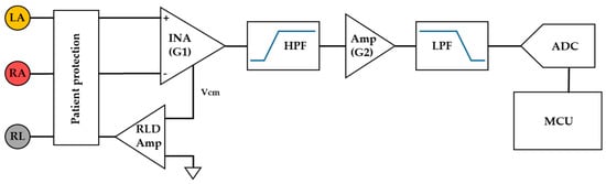 A typical ECG signal acquisition system contains several chained stages of amplification and filtering blocks (see Figure 3). First, an instrumentation amplifier (INA) receives the differential signals captured by the sensing electrodes, through a patient-protection circuit block. This stage often provides low amplification (G1) and it is followed by a high-pass filtering amplifier block (HPF) and a second amplifier stage (G2). Finally, a low-pass filter (LPF) reduces the signal bandwidth according to the ECG frequency range before going into an analog-to-digital converter (ADC) subsystem connected or embedded in a microcontroller (MCU). In many applications, a right leg drive (RLD) amplifier circuit is used to reduce the common-mode interference, in order to enhance the overall front-end system performance. In a classical scheme of ECG acquisition, each block is implemented using several discrete components.