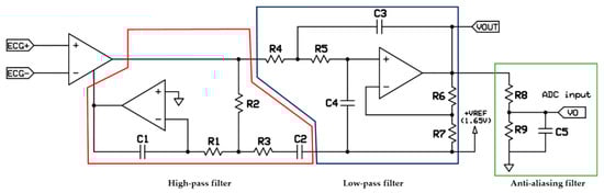 The additional gain in the low-pass filter stage is given by Equation (2). The values of the resistors were chosen to set a system total gain of 1100 V/V, resulting in a differential input range of ±1.5 mV. The system resolution using a 10-bit analog-to-digital converter is 2.93 uV.