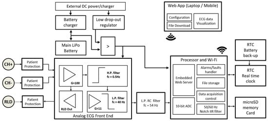 The system proposed was developed using the ESP8266EX (Espressif Systems, Shanghai, China) as a digital processor. The ESP8266 is a low-cost system on a chip (SoC), including a high performance 32-bit RISC processor and 802.11/b/g/n radio transceiver. It has been widely used for the rapid development of smart sensors applications and IoT solutions. The module can perform as a slave with another host microcontroller or a standalone system inasmuch as the Wi-Fi stack leaves up to 80% of the processing capabilities available for user application. The microcontroller core includes a Tensilica LX106 ultra-low-power 32-bit processor capable to operate up to 160 MHz with support for floating-point unit, digital signal processing, and 64 KB + 96 KB RAM memory. Its technical specifications, performance and low-cost have made the device competitive to other architectures, especially in the IoT market. The ESP8266 can be programmed in several platforms and programming languages including, C/C++, MicroPython and LUA, among others. The operation of the arm-ECG wireless sensor also required additional hardware peripherals such as a real-time clock (RTC) with independent battery backup, allowing the system to store a timestamp for the ECG data, and a micro SD memory card to store all the arm-recorded ECG data. The maximum allowable storage capacity is 32 GB.