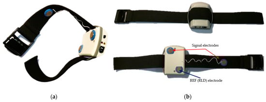 In recent years, technological advances in electronics, wireless communications, sensor materials and physiological data-processing tools have made possible ubiquitous computing available for healthcare applications []. As a result, a variety of experimental wearable smart devices have been developed for ECG monitoring; they include T-shirts or vests [,], belts [,], adhesive patches [,] and armbands []. In addition, there are commercially available systems in the form of portable Holter monitors (e.g., NH-301 (Norav Medical GmhH, Wiesbaden, Germany)), adhesive patches (e.g., Zio (iRhythm San Francisco, CA, USA)) and smartwatches (e.g., Apple Watch 5 (Apple Inc., Cupertino, CA, USA)), targeting similar applications. Still, every technology has its advantages, limitations and drawbacks. Portable Holter devices and ECG patches are currently accepted as medical-grade devices; however, as stated above they use gelled electrodes and adhesive materials that produce skin irritation and are susceptible to detach due to sweat or moisture. ECG monitoring systems based on textile electrodes and ECG T-shirts, in particular, have been studied over the last decade []. They represent an interesting approach to unobtrusive cardiac activity measurement. Nevertheless, they require a stretch fit adapted to the user’s body for tribological noise reduction and they are not designed to be worn for long periods (>24 h). Other approaches, such as smartwatches or smartphone-based ECG recorders, interfere with users’ daily routines since they require touching specific metallic pads on the device for ECG measurement, e.g., KardiaMobile (AliveCor Inc., Mountain View, CA, USA). Therefore, they are only suitable for intermittent patient monitoring. Although ECG armband devices have been less explored than other options, they offer substantial advantages regarding user comfort and adaptability being, therefore, a convenient option for long-term continuous usage.