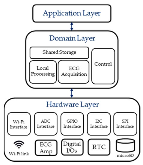 A three-layer structure approach containing the Hardware, Domain and Application layers was adopted for the firmware architecture (see Figure 8). The Hardware layer includes all interfaces and low-level drivers required to handle the different hardware elements including analog-to-digital converter, digital inputs/outputs, Wi-Fi radio, real-time clock and micro SD memory card. The Hardware layer communicates only with the Domain layer. The Domain layer was implemented using a blackboard design pattern, with a shared storage memory space where the ECG acquisition and local processing sub-layers perform read or write operations. Shared memory accesses and operations within this layer are controlled and timed by a Control module. Finally, the Application layer controls the overall firmware behavior.