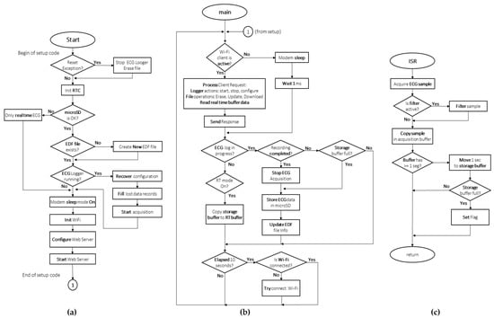 All the data acquisition is interrupt-driven following Figure 9c, with a selectable sample rate of 125, 250 or 500 samples per second. Each ECG sample is acquired, filtered (if configured) and stored in a temporal RAM buffer which holds one second of data. Every second, this acquisition buffer is copied to a secondary storage buffer capable of holding 5 to 10 s of information. When the storage buffer is full, a flag is activated, meaning that the data in the buffer can be written to the microSD memory and the system checks if the recording has reached its expected duration to stop the acquisition process. With the adoption of this dual buffer scheme, we aim to reduce the accesses made to the microSD card. Writing to the microSD card is the second most power-consuming operation in the system (only surpassed by Wi-Fi transmission). The action is also time-consuming and cannot be completed in a time smaller than the sampling period of the ECG signal, hence the need for buffering. With the above described firmware implementation, the storage buffer could be easily expanded, thus further reducing the accesses to the SD card, which could lead to better power consumption. However, this would reduce the amount of RAM available for the future incorporation of complex, real-time processing algorithms as is intended for this device.