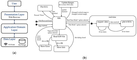 “ECGView” is a basic Web application developed as the data visualization tool for the arm-ECG sensor system (WAMECG1). Created using HTML, CCS and JavaScript programming languages, it can run on personal computers, laptops and Android tablets or smartphones. The application was designed using the three-layer architecture approach shown in Figure 10a. The Data layer is represented by both an ECG data file stored in the computer or mobile, and the Wi-Fi data link for real-time operation. It has the objects and functions to read/receive raw data and deliver them to the Application Domain. This layer processes the ECG data and prepares them for the Presentation layer, which displays the information on the user interface running over a web browser and handles the interaction with the user controls. The simplified state diagram depicted in Figure 10b describes the desired application behavior.