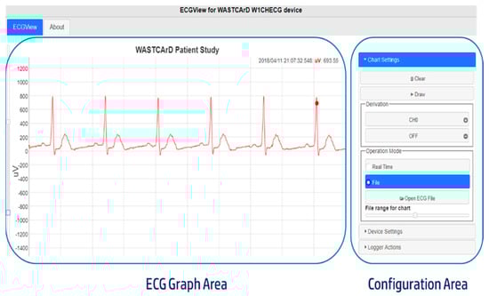 The main screen of the graphical user interface is divided into two parts: the ECG graph area on the left side of the screen and the configuration area on the right, as shown in Figure 11. The user can interact with the ECG graph area using a mouse or a touch controller, being able to manually adjust the Y-axis maximum/minimum values, zoom, pan or scroll the ECG trace for visual inspection, along with other user-friendly interactive functions. The configuration area allows the user to adjust different options including (a) select the system operation mode (real-time or file-based); (b) configure and clear the ECG graph; (c) define ECG acquisition parameters and update recording information; (d) set system’s real-time clock; and (e) start, stop or retrieve the arm-ECG data recording.