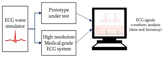 The performance validation of the sensor system was carried out in several steps. Firstly, a synthetic ECG signal was used to test the behavior of the electronic components, ensuring the signal was not distorted by the acquisition process. Amplitude and offset calibration was carried out using a high-resolution ECG acquisition system as reference. The second set of tests characterized several system performance parameters such as noise levels, common-mode rejection ratio, power-line interference rejection and average power consumption. Then, in-vivo measurements were conducted with a few subjects (members within the research team) wearing the arm-ECG sensor prototype while resting and performing low-level physical activities. The recorded signals were visually inspected and quantitatively analyzed to evaluate system performance. The following section describes the methods used to carry out these tests.