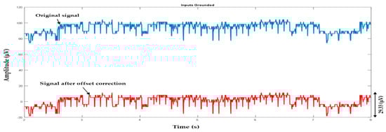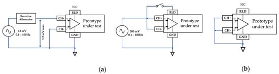 To measure the input-referred noise, the circuit block diagram depicted in Figure 13b was used. Both amplifier inputs were shorted to ground, and the output was recorded with our ECG visualization application for a 1-minute duration. This circuit was also used to measure system offset.