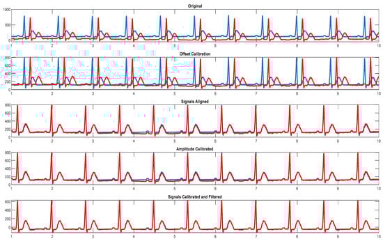 - Difference in amplitude values of the R-peaks and S-peaks (maximal QRS complex signal amplitude span) of the aligned ECG signals is used to calculate required scaling factor value. For this calculation a 1-second signal window was used.