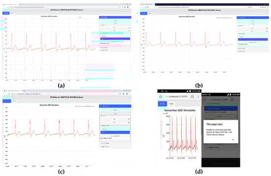 ECGView application running in different setups: (a) Chrome (PC, Win 10); (b) Firefox (PC, Win 10); (c) Chrome (Laptop, Win 7); (d) Android mobile.