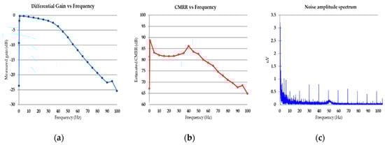 Figure 18 summarizes assessment results for the differential gain (in dB), CMRR vs. frequency, and noise spectrum plots of the system from 0.1 to 100 Hz. The system gain was normalized considering the theoretical gain given by design (1100 V/V).