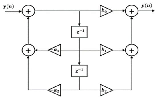 Power-line noise interference signals (50 or 60 Hz) are coupled into the system in common mode. For this work, we incorporated two noise mitigation strategies typically found in ECG acquisition systems: (a) the use of right-leg drive circuit; and (b) noise removal by a digital notch filter. A two-pole digital infinite impulse response (IIR) filter was implemented in the acquisition firmware of the microcontroller using a Direct Form II structure (Figure 19), which is easy to implement for real-time embedded applications due to its low computational cost, allowing filtering the data samples as soon as they are acquired. The effectiveness of the results achieved using these power line denoising strategies for the case of 50 Hz is illustrated in Figure 20. For each case, the SNR was used as the indicator of the improvement in noise rejection.