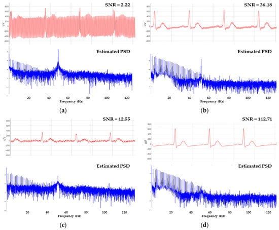 The 50 Hz power-line noise mitigation strategies results: (a) raw signal (no noise mitigation); (b) use of RLD circuit for common-mode noise reduction; (c) power-line removal using IIR notch filter; (d) combination of both strategies (final result).