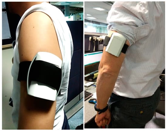Photos of the devised arm-ECG sensor prototype (WAMECG1) being worn by volunteers.