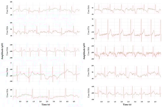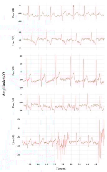 Arm-ECG signals from users working in the laboratory. The signal recorded from User No. 5 was strongly contaminated by muscular artifacts making it unusable for the rest of the test.