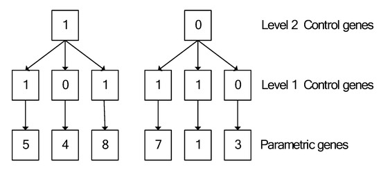 Figure 2 shows that a chromosome comprises six control genes in the form of bits and six parametric genes in the form of integers, where X represents a chromosome with a length of 2 and a solution of 5 and 8. In addition, multi-layered chromosomes are formulated by increasing the level of stratification in the chromosome. Figure 3 illustrates an example of a three-level chromosome.