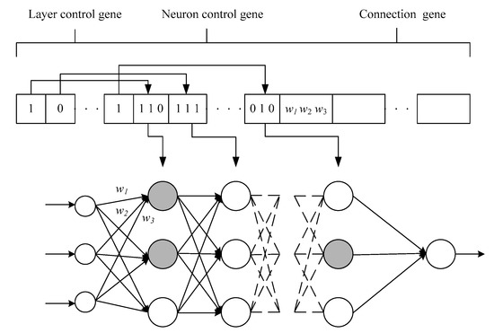 A hierarchical chromosome representation is shown in Figure 4. Each chromosome contains a control gene and a connection gene. A control gene in the form of bits activates layers and neurons. A connection gene, which is a real value representation, has connection weights and neuron biases. Figure 5 presents the structure of a hierarchical neural network, where w1, w2, and w3 represent the weights of neural networks.