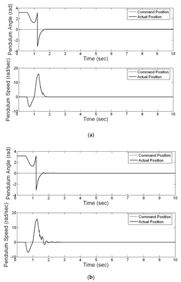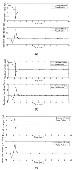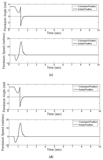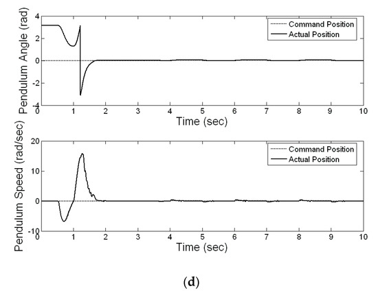 where and represent the actual angle of the pendulum and the referred angle of the pendulum, respectively, and and denote the actual speed of the pendulum and the referred speed of the pendulum, respectively. Table 1 shows the experimental results of the sum of the absolute error for the pendulum angle () and pendulum speed ().