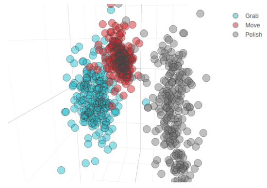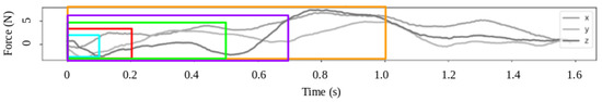 - Force based operator’s intention inference. We implemented two different approaches, and both were thoroughly evaluated and compared. Finally, one of them was selected and used during the validation with users. Inference time and the possibility of including contextual information were considered for the comparison. The first approach consisted of a k-nearest neighbor classifier, which uses as the metric dynamic time warping. In this case, the time series data are directly fed to the classifier. The second approach was based on dimensionality reduction together with a support vector machine classifier. The reduction was performed over the concatenation of all force axes of the raw time series.