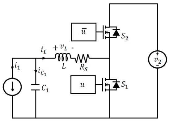 Figure 2 depicts the schematic diagram of the BHBC that is used as the interlinking converter in the microgrid. The left side of the converter is considered as port 1, its voltage denoted as and its capacitance as , while the right side is considered as port 2, its voltage denoted as and its capacitance as . Inductor L is connected at port 1, while the parasitic resistance of the circuit is represented in series with the inductor as . Depending of the operation scenario, three operation modes can be identified: (a) power transfer between buses (constant voltage loads), (b) buck mode regulating ELVDC bus voltage, and (c) boost mode regulating LVDC bus voltage.