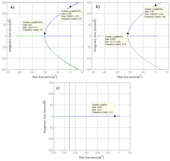 Root loci for interlinking converter (ILC) operation modes: (a) boost mode, (b) buck mode, and (c) power transfer mode.