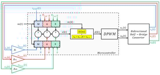 As mentioned before, the main contribution of this paper is the unified way in which the control works irrespective of the operating mode. Then, considering the use of integral controllers for the three operating modes, a change of mode only represents the change of the gain of the controller. Figure 10 shows a diagram depicting in detail the implementation of the proposed control. This diagram includes the gain of the sensors measuring current and voltages () and also a representation of the digital realization of the mathematical computations. The whole control approach can be classified as a gain scheduling solution, but it can be also interpreted as a kind of switched control because of the way in which discrete events define the operation mode of the converter. Mode selection is provided by an external signal or combination of signals, which is summarized in Figure 9 with the variable and can be understood as follows: in nonoperation mode, in buck mode, in boost mode, and in power transfer mode. The voltage references are fixed to standard levels in the studied microgrid, and only the reference for the power transfer mode is considered as a signal defined outside of the microcontroller.