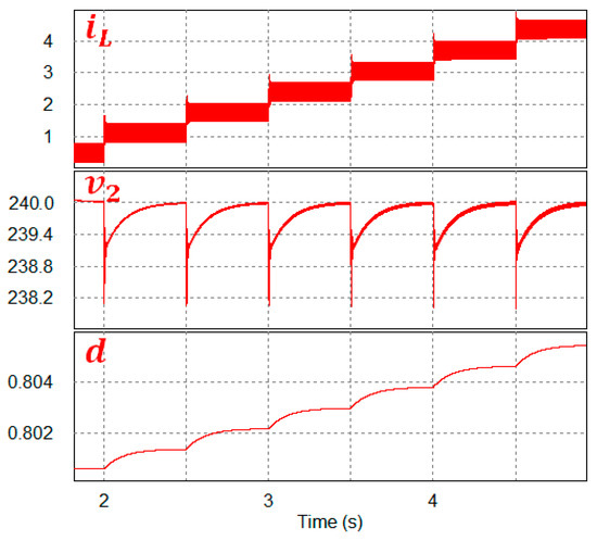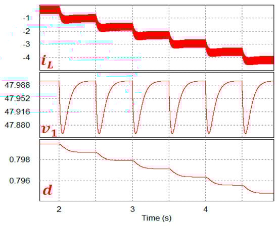In this mode, the validation was performed starting from a steady state in which the output voltage () was regulated to 48 V feeding a constant current load () of 416 mA. Like in the previous test, starting at 2 s, and every 500 ms, the current load was changed, introducing positive steps of 625 mA and ending with a load of 4.16 A. Note that the sign of the inductor current is negative due to the power flow in this operation mode. Figure 12 depicts the ability of the converter to reject load disturbances, showing both voltage deviations below 0.4% and a settling time of about 0.5 s to recover the steady state in all cases. Like in the boost mode, a response independent of the operation point was observed.