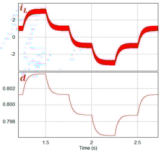 The control objective in this mode is to enforce . As it can be noted in Equation (9), the transfer function has a negative sign, and then, unlike the boost mode, the proposed controller needs to have a negative sign. Then, the following integral controller is selected (). As in the boost mode, the performance of this control is measured in terms of load disturbance rejection. The closed-loop block diagram is depicted in Figure 6, where , , and .