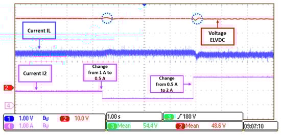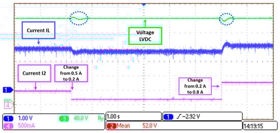 In this test, sudden increasing and decreasing changes were applied to the load current . The experiment started from an initial value of 50% in the nominal output power connected to the LVDC bus, which corresponded to 0.5 A. After 2 s, a decreasing step was introduced, leading the load to 20% of the nominal output power. Six seconds later, an increasing change of 20%–80% of the nominal power was introduced (i.e., from 0.2 to 0.8 A), the latter being a large-signal sudden change. It can be corroborated that the bus remained regulated and the control was robust to load disturbances. As shown in Figure 17, the system recovered the regulation of the bus around 0.5 s after the disturbance penetration, showing voltage deviations lower than 5% of the nominal LVDC voltage.