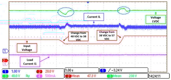 In this test, sudden changes were applied to the input voltage source representing the regulated ELVDC bus. The voltage started from its nominal value of 48 VDC, and 3 s later, its value decreased to 38 VDC. Three seconds later, the voltage of the source changed to 57 VDC. As shown in Figure 18, the system was able to reject input voltage disturbances rapidly, even when deviations were greater than ±20% of the nominal value. After the emergence of a disturbance, the LVDC bus took approximately 650 ms to recover its regulated voltage, showing maximum deviations of 5% of the nominal LVDC voltage.