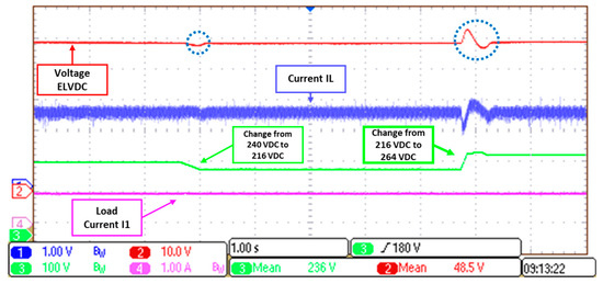 As shown in Figure 20, two sudden changes were applied to the voltage source representing the regulated LVDC bus. The voltage started from its nominal value of 240 VDC, and 2.6 s later, its value decreased to 216 VDC. The ELVDC voltage showed a deviation lower than 5% of its nominal value, recovering the steady state in approximately 250 ms. Five seconds later, the voltage of the power source changed to 264 VDC. For this large-signal disturbance, the system showed a voltage deviation of about 10% of the nominal value, recovering the steady state after approximately 0.8 s.