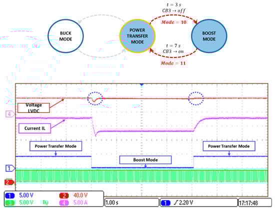 Figure 16 shows a schematic diagram of the experimental configuration. Both programmable loads were configured to operate as current sources. Circuit breakers CB1 and CB3 allowed for connecting or disconnecting the voltage sources to their corresponding buses in order to test the voltage regulation modes. Circuit breakers CB2 and CB4 allowed for connection of the loads, but they were permanently closed during the test. To test the buck mode, the circuit breaker CB1 was turned off, while the others remained closed. To test the boost mode, the circuit breaker CB3 was turned off, while the others remained closed. To test the power transfer mode, all the breakers were closed. In the experiments, the change between modes was performed manually.