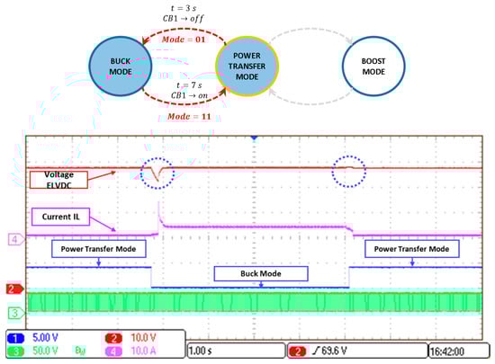 As mentioned in the previous subsection, the system operating in power transfer mode indicates that other converters regulate the voltage of the DC buses. A change to the buck mode in the microgrid can also appear at night if the batteries are charging using a constant current regime, limiting the ability to regulate the energy storage system. Like the scenario presented before, the system started transferring approximately 50 W to the ELVDC bus. As shown in Figure 23, after 2.75 s, the system changed to buck mode, assuming completely the load connected to the ELVDC bus (240 W). Four seconds later, the system changed to operating in power transfer mode, contributing the same difference of 50 W. In this experiment, the maximum voltage deviation during transfer was lower than 10%. However, it is worth mentioning that when returning to the power transfer mode, the deviation was considerably lower (around 2%). In addition, in both transitions, the system recovered steady state after 200 ms.