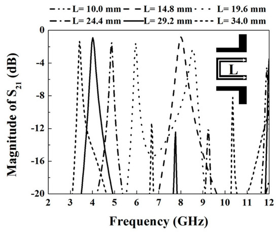 Firstly, the centered frequencies of the two passbands should be determined in accordance with the application of direct-sequence ultra-wideband bandpass (DS-UWB). The resonator is simply constructed by using a half guided-wavelength (λg/2) high-impedance line, where λg is the guided-wavelength at the specific frequency. The line with high impedance, 158 ohms in this case, is needed to have a strong coupling with a suitable gap to the input/output ports. To simplify the design, the impedance as well as the width of two resonators is the same. Figure 2 displays the resonant frequencies of the half-wavelength high-impedance line with different physical lengths. In the design, the required center frequencies of the first and second passbands are around 4.2 and 7.8 GHz, respectively. It is found that the resonator with a physical length of 29.2 mm excites a resonant peak at 4 GHz, responsible for the first passband at 3.4–5.0 GHz, and the resonator with the physical length of 14.8 mm excites a resonant peak at 8 GHz, responsible for the second passband at 6.0–10.0 GHz. Thus, L1 of 14.8 mm and L2 of 29.2 mm are firstly chosen for the first and second resonators, respectively.