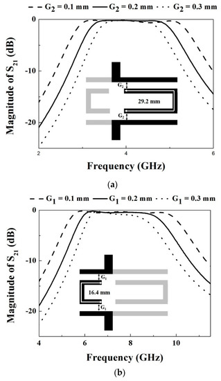 (a) First passband and (b) second passband responses simulated by tuning the coupling gap of (a) G1 and (b) G2, respectively (W = 0.2 mm, L1 = 16.4 mm, L2 = 29.2 mm, Lc1 = 6.9 mm, Lc2 = 13.7 mm, Ls1 = 4.9 mm, and Ls2 = 4.4 mm).