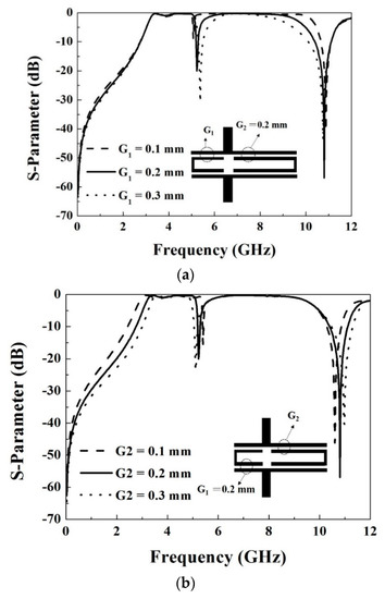 Figure 3 shows the band responses with different coupling gaps (G1 and G2) between the resonators and the input/output lines. It is noted that the harmonics mode at 7.8 GHz of the first resonator, as shown in Figure 2, would also be combined with the resonant mode of the second resonator to form the second UWB passband response. Thus, the physical length of the second resonator shall be slightly tuned to satisfy the requirement of the second UWB passband response. After optimized simulation, the physical length L1 is selected as 16.4 mm for the second passband at 6.0–10.0 GHz. The gaps G1 and G2 of 0.2 mm can achieve the desired bandwidths for the first and second passbands and are larger than the minimum operating range of the circuit board engraving machine.