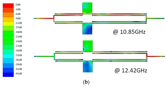 Current distributions are used to confirm the resonant conditions of this UWB filter [1]. Figure 6a shows the simulated current distributions at the center frequencies of two passband responses, namely at 4 and 8 GHz. As discussed in Step 2, the strong coupling effect of the half-wavelength high-impedance line with narrow coupling gap (G1 and G2) is used to excite the two ultra-wideband responses. Therefore, most current energy is absorbed by these resonators, thus creating a two-coupling path to excite two passband responses. Figure 6b shows the simulated current distributions of the filter at the frequencies of the transmission zeros. As discussed in Step 4, when the tapped open stubs are regarded as the quarter-wavelength resonator, the transmission zeros are also created. Obviously, two tapped open stubs absorb, relatively, a lot the current energy, and the energy of the two half-wavelength high-impedance lines is not enough to excite a response, even with narrow coupling gaps (G1 and G2), thus forming transmission zeros at 10.85 GHz and 12.42 GHz.