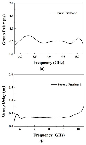 Group delays of the measured results in the (a) first passband and (b) second passband.