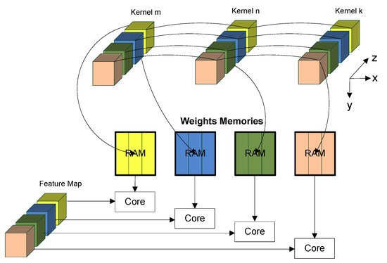 Inter-output parallelism is applied by storing several different kernels in the same memory, that is, each memory position contains weights with the same index from different kernels. Hence, each activation is multiplied by weights of different kernels contributing to different dot-products, that is, to different output feature maps. The proposed optimized architecture also considers intra-output parallelism, where multiple activations of a single output feature map are generated in parallel. The partition of the feature map memory follows the same structure of the baseline architecture. However, while, in the baseline architecture the weights memory is the same for all cores in a column, in the optimized architecture, it cannot share the kernels among cores in the same column since activations from different ports of the feature map memory may have different indexes and, therefore, require access to different weights of the kernel. The weights memory must have multiple ports, one for each port of the feature map memory. Since the FPGA memories only have at most two parallel ports, data have to be replicated using more memories.