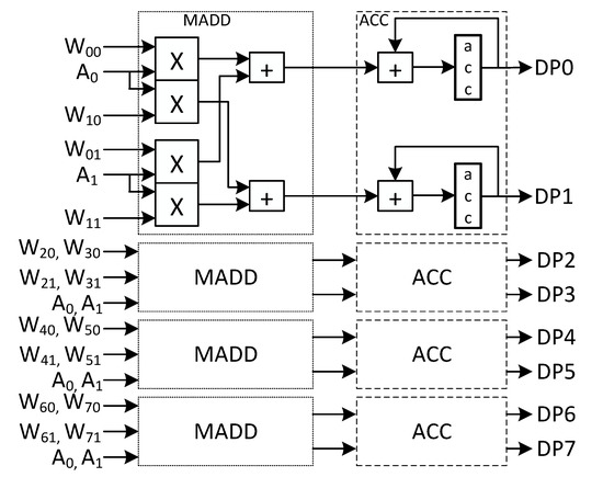 To explore dot-product parallelism, the core implements parallel MAC units to process multiple multiplications between activations and weights read in a single memory access. The baseline architecture considers 8-bit fixed-point data and 64-bit memory accesses. Therefore, each core processes and accumulates eight multiplications in parallel.