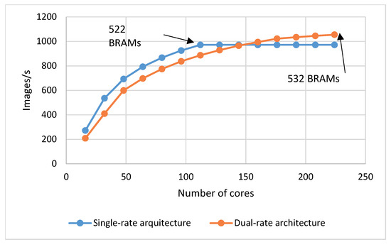 The performance breakthrough point is at around 150 cores, when the dual-rate architecture becomes faster than the single-rate solution. The increase in performance of the dual-rate architecture from this point on is not so evident because the execution becomes limited by the external memory bandwidth. Without this limitation, the scalability of the architecture would permit an almost linear increase in performance until reaching the parallelization limits.
