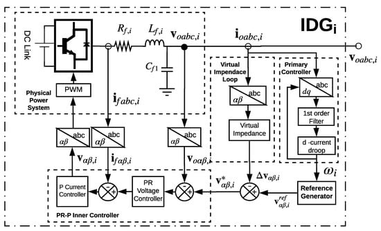 Each IDG of the IMG consists of a physical power system, a virtual impedance loop, a PR-P inner controller and a d-current droop primary controller, as shown in Figure 2.