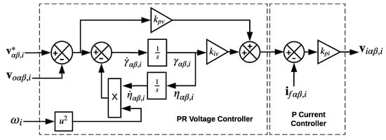 where is the amplitude voltage reference value and . To simplify the notation, the vectors , are introduced. The voltage reference signal () is used as voltage reference input for the inner controller. The inner control architecture is based on a proportional resonant (PR) voltage loop and a proportional current loop, which is selected due to its zero steady state tracking error characteristics and simple implementation [23]. In addition, these control loops are designed to supply nonlinear currents to nonlinear loads and to suppress voltage harmonics produced by this kind of loads. A general scheme of the physical power system and the inner inverter controller is shown in Figure 3.