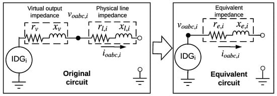 Each IDG local controller implements a virtual impedance loop, where a dominant output impedance is emulated, where and are the virtual resistance and reactance parameters. The equivalent IDG circuit is presented in Figure 4. As we can see, the equivalent line impedance parameters can be defined as , where and . The virtual loop impedance is implemented in the stationary reference frame ( coordinates) as [23], and can be represented by: