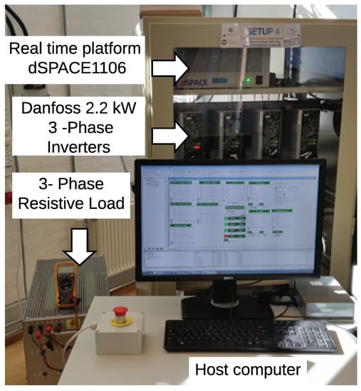 The effectiveness and accuracy of the proposed model was verified via an experimental validation of a study case with two IDGs. The IMG architecture shown in Figure 1 is implemented in an experiment set-up at the Aalborg Intelligent Microgrids Laboratory [36], which is shown in Figure 5. The experimental setup consisted of two IDGs, implemented with commercial Danfoss 2.2 kW inverters and LC output filters, which emulated an islanded IMG with mismatched line parameters. The measurements were performed using LEM sensors, and the control algorithms were implemented on the real time platform dSPACE1106 board, which provided computing power for the real-time system and also functioned as an interface with the host PC and with the input/output boards. The control models were developed in Matlab/Simulink, compiled in C++, and ran on the DS1006 processor board of dSPACE real-time control platform. The system specifications are listed in Table 1.