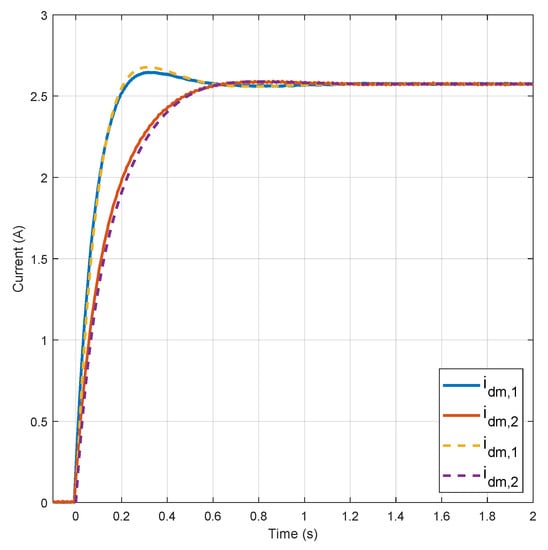 An experimental case of two IDGs operating in island is presented in this section. In the initial state, the generators are operating synchronized without load. At , a resistive load () is suddenly connected and the transient response of the direct and quadrature current, as well as the frequency and amplitude voltage (approximated as the direct component of the voltage in dq-reference frame), are recorded by the dSCAPE real-time acquisition system. Figure 6, Figure 7, Figure 8 and Figure 9 show the transient response of the experiments (solid lines) and the transient simulation of the model represented by Equations (27)–(31) (dashed lines).