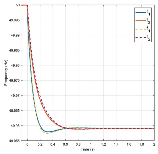 In Figure 6 we can see that the compact model reproduces with accuracy the experimental response of the direct currents. Similarly, the transient behavior of the references frequencies of each IDGs is shown in Figure 7.