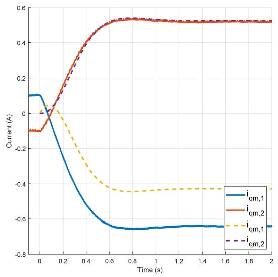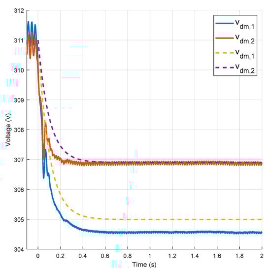 On the other hand, the transient response of the quadrature current components and the direct component of the output voltages are shown in Figure 8 and Figure 9. It is shown that the model of the quadrature current components and the output voltages representing Equations (27)–(31) captures the main settling time and dynamics. In these figures, we can observe that, although the transient simulation of the compact model captures the main settling time and dynamics, there are small offset errors between the experimental results and the model simulation for the second quadrature current and voltage signals ( and ). This situation can be the result of the low accuracy in the lecture from the hall sensors measurements and would be studied in future research.