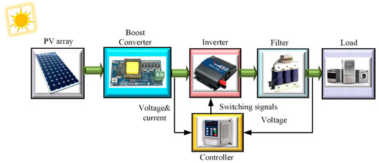 The solar photovoltaic (PV) is known as one of the important renewable energy resources and has notably increased in industries and remote areas over the past few years [1]. In addition, with proper equipment such as an inverter, a grid-connected system can be developed with the harvested energy [2]. In a PV system, the inverter plays an important role in providing a sine output waveform with suitable range of controlled frequency, voltage, and load, thus confirming the steady-state operation [3]. Some features of PV inverter characteristics are taken into account in designing the inverters, including simple design, stability, flexible control, unity power factor, high reliability, low total harmonic distortion (THD), high efficiency, and low cost [4,5]. In addition, the inverter size and weight are key features in designing inverters [6]. However, the vital issues in PV inverter design are the PV nonlinearity characteristic and fluctuation in the output [7]. Hence, stability, power quality, as well as reduction of output fluctuation should be ensured when designing a PV inverter control system. A boost converter (DC to DC) is used for low output power conversion systems [8].