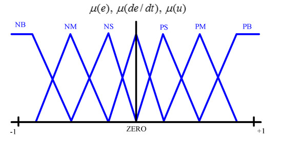 In this research, the double inputs and single output are employed to construct the FLC structure. During fuzzy control operation, each input variable and output are normalized in the boundary between −1 and +1 in order to obtain satisfactory perfection. The five membership functions of type triangular and two of type trapezoidal are used as input variables, as displayed in Figure 3. A fuzzy set including two input variables and one output variable are used in this research work and are presented as NB (negative big), NM (negative medium), NS (negative small), ZE (zero), PS (positive small), PM (positive medium), and PB (positive big) [23,24].
