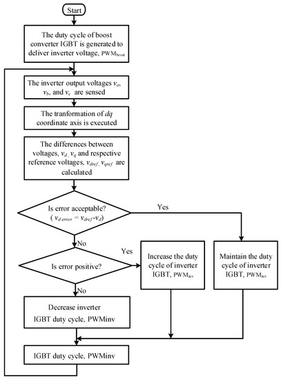 It is observed that PWM signal generation is required for the generation of an IGBT duty cycle at the final process. Firstly, the boost converter IGBT, PWMboost duty cycle, is assigned to achieve the required inverter DC voltage at the input stage. Then, the sensing operation of the inverter output voltages, va, vb, and vc, is implemented. After, the voltage regulation process is executed by transforming the voltage values into dq coordinate frames where the voltages vd and vq are compared to their respective reference voltages vdref and vqref. At this point, the voltage comparison process generates an error signal, which in turn is converted into duty cycle generation for the inverter PWMinv. A higher duty cycle is created by the positive error, while a relatively lower duty cycle is produced by the negative error. This procedure continues until a lowest error level in voltage is achieved which confirms the steady-state condition.