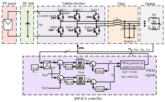 Figure 5 shows the control algorithm for an inverter (three-phase) in a stand-alone application. It is observed that the algorithm includes several functional blocks including direct-quadrature transformation (abc to dq), fuzzy logic controllers, PWM signal generator and signal converter, and phase lock loop (PLL)-type frequency synchronization. The stable operation of frequency control is provided by the PLL block so that the output frequency can reach a desired frequency. The power is delivered only to the local loads in standalone mode. In a voltage-control scheme, the output voltages of the inverter operate and are expressed in Equations (9)–(11). The three phase voltages are displaced 120° to each other and has a unity power factor which is transformed to dq components.